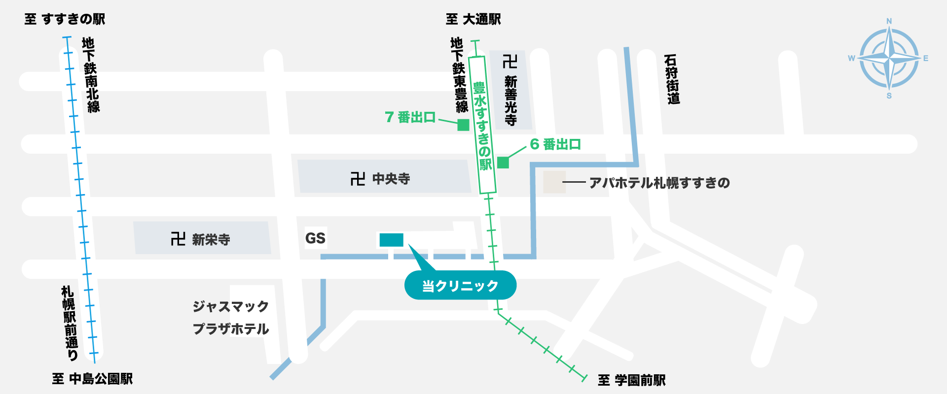 豊水すすきの駅から徒歩すぐ。 鴨々川沿いの落ち着いた 雰囲気のクリニックです。